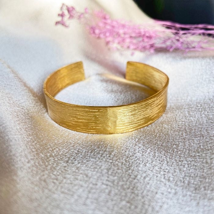This brushed gold bangle's textured surface makes it unique and eye catching. Created by skill artisans this piece is perfect for an occasion, whether you're wearing it in the summer sun or for a work day meeting it's your everyday staple piece.