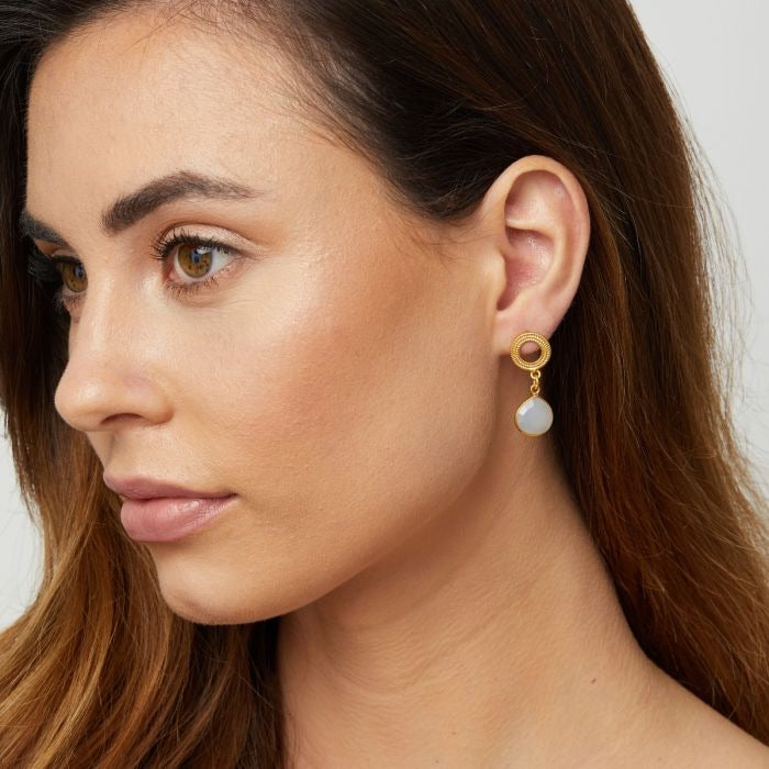 These earrings feature pretty gold ring studs leading to semi precious white chalcedony gemstones.